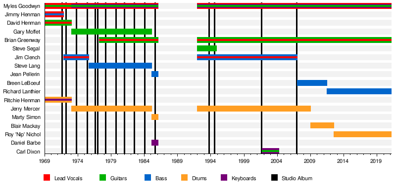 | Past members | Jim Henman David Henman Ritchie Henman Gary Moffet Steve Lang Steve Segal Carl Dixon Jim Clench Jerry Mercer Breen LeBoeuf Blair Mackay |
