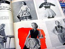 Post-war family values made the apron the symbol of home, family, mother and wife. As sewing machines and cloth became available, aprons—both commercial and homemade—became the uniform of the professional housewife.[8] Magazines from the 1940s and 50s feature apron-adorned women in nearly every advertisement that is related to housework or cooking, including those for irons, kitchen appliances, and food products. The 1950s brought out the half-aprons of highly starched cotton, feedsack, and for special occasions sheer fabric trimmed with lace. Two-piece aprons and short smocks of bright cotton prints for every day use were also popular.