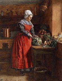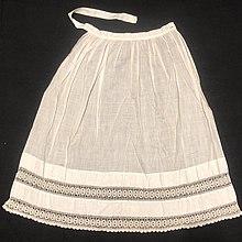In England and the United States in the 1800s, both maids and wealthy women wore aprons. Servant aprons were traditionally white and were supposed to be “clean, neat and appropriate.”[12] The maid's clothing was meant to follow the fashion trends of the time while also representing her employer's class status and wealth.[13] Some aprons had lace, embroidery or pleating work on them to add a bit of sophistication if they were servants who regularly appeared in front of house guests.[14]