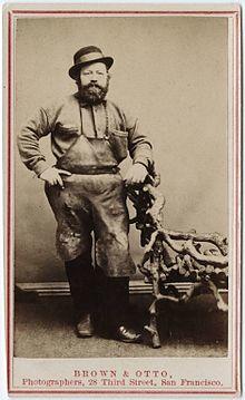 In Europe during the Middle Ages, aprons were worn by blacksmiths, armor and weapon makers, gardeners, carvers, furniture makers, leather smiths, cobblers, tailors, jewelers, metal forgers, fishmongers, clock makers, homemakers, tradesmen, artisans and masons.[7] Tradesmen in general were called "apron men," as aprons were so common that distinguishing styles emerged between the various trades. For example, English barbers were known as "checkered apron men.”[8] Cobblers wore black to protect garments from the black wax used on shoes. Butchers wore blue stripes. Butlers wore green aprons. Blue was commonly worn by weavers, spinners, and gardeners. Stonemasons wore white aprons as protection against the dust of their trade, and even in the twenty-first century, aprons survive as part of Masonic ceremonial attire. These aprons were long, coming down to below the knees, with a flap or bib to protect the chest. The Union of the Grand Lodge of England between the Ancient and Modern branches of English Freemasonry in 1813 brought into many effect many changes in dress and ritual which still prevail to this day. In respect to the Masonic apron it was felt necessary to have these standardised and the resulting effort are the aprons we have in use today.[9] The Dutch worn aprons bordered with black and with a skull and crossbones on the flap. Scottish lodges each have their individual right to choose the design, colour and shape of their aprons; some employ a tartan, while many others have a circular rather than a triangular flap.[9] Soldiers of the French Foreign Legion wore leather aprons as part of their ceremonial dress as early as the 18th century.[1]