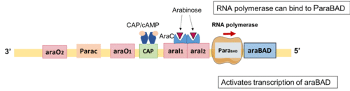 Expression of the araBAD operon is activated in the absence of glucose and in the presence of arabinose. When arabinose is present, both AraC and CAP work together and function as activators.[16]