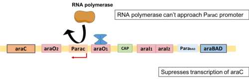 The expression of araC is negatively regulated by its own protein product, AraC. The excess AraC binds to the operator of the araC gene, araO1, at high AraC levels, which physically blocks the RNA polymerase from accessing the araC promoter.[20] Therefore, the AraC protein inhibits its own expression at high concentrations.[16]