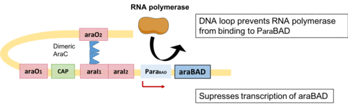 When arabinose is absent, cells do not need the araBAD products for breaking down arabinose. Therefore, dimeric AraC acts as a repressor: one monomer binds to the operator of the araBAD gene (araO2), another monomer binds to a distant DNA half site known as araI1.[12] This leads to the formation of a DNA loop.[13] This orientation blocks RNA polymerase from binding to the araBAD promoter.[14] Therefore, transcription of structural gene araBAD is inhibited.[15]