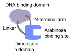 The L-arabinose system is not only under the control of CAP-cAMP activator, but also positively or negatively regulated through binding of AraC protein. AraC functions as a homodimer, which can control transcription of araBAD through interaction with the operator and the initiator region on L-arabinose operon. Each AraC monomer is composed of two domains including a DNA binding domain and a dimerisation domain.[9] The dimerisation domain is responsible for arabinose-binding.[10] AraC undergoes conformational change upon arabinose-binding, in which, it has two distinct conformations.[6] The conformation is purely determined by the binding of allosteric inducer arabinose.[11]