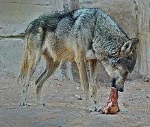 Arabian wolves are mainly carnivorous, but also omnivorous and in some areas largely dependent on human garbage and excess products.[17] They also feed on hares, rodents, small ungulates, cats, sweet fruits, roadkill and other carrion.[21] Opportunistically almost any small animal including fish, snails, baby baboons can be part of their diet.[22] Because Arabian wolves can attack and eat any domestic animals up to the size of a goat, Bedouins and farmers will not hesitate to shoot, poison, or trap them.[23]