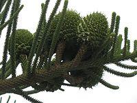 The young leaves are soft and awl-shaped, 1–1.5 cm (3&fras1;8–9&fras1;16 in) long, about 1 mm (1&fras1;32 in) thick at the base on young trees, and incurved, 5–10 mm (3&fras1;16–13&fras1;32 in) long and variably 2–4 mm (3&fras1;32–5&fras1;32 in) broad on older trees. The thickest, scale-like leaves on coning branches are in the upper crown. The cones are squat globose, 10–12 cm (4–5 in) long and 12–14 cm (5–6 in) diameter, and take about 18 months to mature. They disintegrate at maturity to release the nut-like edible seeds. The seeds have a length of 2.5 to 3 cm (1 to 1 1&fras1;8 in) and a diameter of about 1.2 cm (1&fras1;2 in) with wide wings. There are four cotyledons present. It is a dioecious tree (male and female flowers in different plants), although it can also be monoecious.