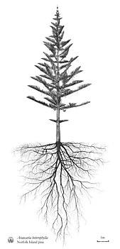 It is a slow growing tree, reaching a height of 50–65 m (160–210 ft), with straight vertical trunks and symmetrical branches, even in the face of incessant onshore winds that can contort most other species. From the straight trunk, it emits its branches almost horizontal or slightly oblique, in number of five, forming floors; the plane of each floor is a perfect pentagon. If kept indoors, the tree remains smaller. The gray-brown bark falls off in fine scales. At the more or less horizontal to sometimes hanging branches, the branches are four to seven in regular whorls.