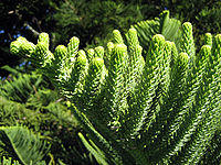 Araucaria heterophylla (synonym A. excelsa) is a vascular plant in the ancient and now disjointly distributed conifer family Araucariaceae. As its vernacular name Norfolk Island pine (or Norfolk pine) implies, the tree is endemic to Norfolk Island, a small island in the Pacific Ocean between New Zealand and New Caledonia, about 1,440 km (890 mi) east of Sydney, Australia but is cultivated elsewhere as an ornamental. The genus Araucaria occurs across the South Pacific, especially concentrated in New Caledonia (about 700 km or 430 mi due north of Norfolk Island) where 13 closely related and similar-appearing species are found. It is sometimes called a star pine, Polynesian pine, triangle tree or living Christmas tree, due to its symmetrical shape as a sapling, although it is not a true pine.