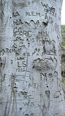 Carving names and initials into trees is a common practise among lovers; the carvings can last for decades, as a symbol of the permanence of the couple's love. This practise would appear to date back up to the Classical era, with Callimachus writing in his Aetia, "But graven on your bark may ye bear such writing as shall declare "Cydippe beautiful"." (fragment 73) It also appears in the Eclogues of Virgil: "Resolved am I in the woods, rather, with wild beasts to couch, and bear my doom, and character my love upon the tender tree-trunks: they will grow, and you, my love, grow with them."[2] This carving was also practised in Renaissance England, as evidenced by the writings of William Shakespeare (in As You Like It, 1599) and John Evelyn (in Sylva, 1664).[3]