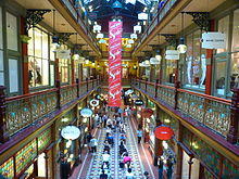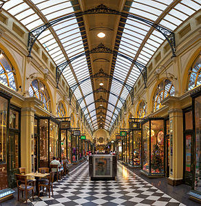 The French architect, Bertrand Lemoine, described the period, 1786 to 1935, as l’Ère des passages couverts (the Arcade Era).[5] He was referring to the grand shopping "arcades" that flourished across Europe during that period. A shopping arcade refers to a multiple-vendor space, operating under a covered roof. Typically, the roof was constructed of glass to allow for natural light and to reduce the need for candles or electric lighting.[6] The 18th and 19th century arcades were designed to attract the genteel middle classes. In time, these arcades came to be the place to shop and to be seen. Arcades offered shoppers the promise of an enclosed space away from the chaos that characterised the noisy, dirty streets; a warm, dry space away from the harsh elements, and a safe haven where people could socialise and spend their leisure time. As thousands of glass covered arcades spread across Europe, they became grander and more ornately decorated. By the mid-nineteenth century, they had become prominent centres of fashion and social life. Promenading in these arcades became a popular nineteenth-century pastime for the emerging middle classes.[7]