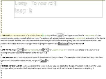Leaping to document landmarks such as next or previous word, line, page, section, and document amounts to leaping to Space, New line, Page, and Document characters, which are inserted using the Spacebar, Enter, Page and Document keys respectively. On a standard computer keyboard, Archy uses the Alt keys as Leap keys, Backquote (`) as a Document character and Tilde (~) as a Page character.