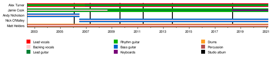 Arctic Monkeys are an English rock band formed in Sheffield in 2002. The group consists of Alex Turner (lead vocals, guitar, keyboards), Jamie Cook (guitar, keyboards), Nick O'Malley (bass guitar, backing vocals), and Matt Helders (drums, backing vocals). Former band member Andy Nicholson (bass guitar, backing vocals) left the band in 2006 shortly after their debut album was released.