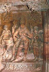 - ^ Rao pp. 327–8: The male half of the four-armed Ardhanarishvara at Badami wears snake ornaments and a knee-length deerskin dress and holds a parashu. His jatamukuta is adorned by the crescent moon as well as a skull. The female side wears gold ornaments and an ankle-length silk garment, and carries a nilotpala. Together with the remaining arms, Ardhanarishvara plays a veena. The skeleton figure identified with Bhringi stands beside him. The bull stands behind the deity.