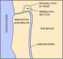 Marble Hill, although administratively a part of the Borough of Manhattan, was severed from Manhattan Island by the construction of the Harlem River Ship Canal during 1895. The by-passed segment of the Harlem River was filled in 1914, making the community a geographic part of the Bronx.