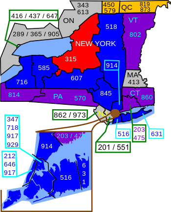 Area codes 315 and 680 are telephone area codes of the North American Numbering Plan for the north-central area of the U.S. state of New York. The overlay numbering plan area extends from the western side of Wayne County to Little Falls, north to the Canada–United States border, east to Massena and south to near Cortland. Most of the area's population lives in Syracuse and its suburbs. Other major population areas include Utica and Watertown. Area code 315 was one of the original area codes created in 1947. The overlay plan was created in 2017 by assigning area code 680 as the second code for the numbering plan area.