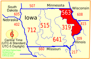 Area code 563 is a telephone area code for the east central and northeast corner of the state of Iowa, and includes most of the Iowa side of the Quad Cities. Area code 563 was split from area code 319 in 2001, becoming active on March 25, 2001, and finally becoming mandatory on December 2, 2001.