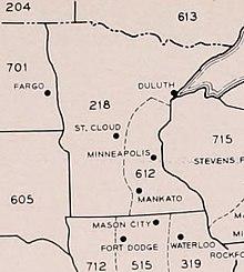 At the outset, Minnesota received two area codes, 612 and 218. According to a 1947 map of the NANP, 612 covered roughly the southeastern third of Minnesota. The rest of the state was 218, which formed an r-shaped region around the 612 area code. The separating line extended westward from Duluth to the center of the state, then down through the center.