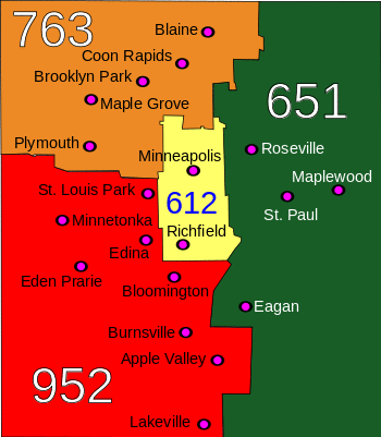 The area code splits in the Twin Cities are unusual because they split along municipal, rather than central office, boundaries. This led to a sizable number of exchanges being divided between two area codes, and a few being divided among three.[2]