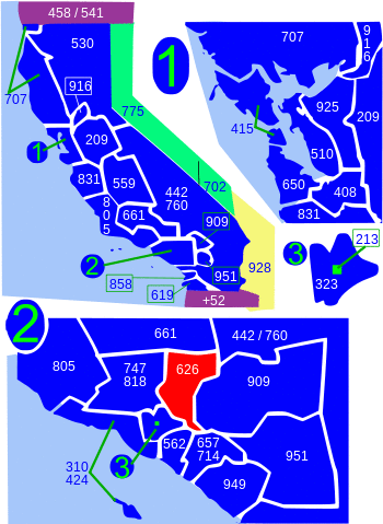 | West: 323, 747/818 | Area code 626 | East: 442/760, 909 |