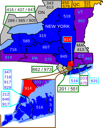 Area code 914 was one the first area codes announced when the North American Numbering Plan was created in October 1947.[1] It was originally assigned to Delaware, Dutchess, Nassau, Orange, Putnam, Rockland, Suffolk, Sullivan, Ulster, and Westchester counties, an area largely coextensive with the New York state portion of the New York metropolitan area, excluding New York City itself which received area code 212. In 1951, Long Island (Nassau and Suffolk counties) receieved their own area code 516,[1][2].