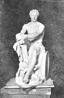 In one archaic myth, related only in the Iliad by the goddess Dione to her daughter Aphrodite, two chthonic giants, the Aloadae, named Otus and Ephialtes, threw Ares into chains and put him in a bronze urn, where he remained for thirteen months, a lunar year. "And that would have been the end of Ares and his appetite for war, if the beautiful Eriboea, the young giants' stepmother, had not told Hermes what they had done," she related.[65] "In this one suspects a festival of licence which is unleashed in the thirteenth month."[66]
