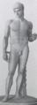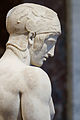 The cult and representation of Ares are very rare in the ancient Greek world, especially in sculpture. It has been thought that this statue may be derived from one by Alcamenes, an Athenian sculptor who, according to Pausanias (I, 8, 4), made a statue of Ares that was erected on the Athenian agora. However, the temple of Ares to which he refers had only been moved from Acharnes and re-sited in the Agora in Augustus's time, making this a chronological impossibility. Also, statues known to derive from Alcamenes' statue show the god in a breastplate (one is depicted in this relief). So, in all, this statue may not be a copy of Alcamenes's, but instead a Roman creation according to a classicising or Neo-Attic type.