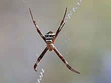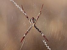 Argiope aetherea is a common, large orb-web spider (family Araneidae). Like other species of Argiope, it is commonly known as the St Andrew's Cross spider, due to the characteristic cross-shaped web decorations female spiders often include in their webs. A. aetherea is similar in appearance to A. keyserlingi, however female A. aetherea are generally larger than A. keyserlingi.[2] Like most orb-web spiders, A. aetherea shows considerable sexual size dimorphism, with females being many times larger than males.