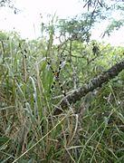 On Guam, where Argiope appensa is ubiquitous, it is frequently visited by Argyrodes argentatus, that steals food from the host.[5] Locals there refer to them as banana spiders. Following the introduction of the brown tree snake and the subsequent extinction or near-extinction of many of the island's small birds, spider populations on Guam exploded in response to decreasing predation and competition. Nature writer David Quammen has called Argiope appensa "almost certainly one of the larger species" which were encountered in vast numbers during his research trip to Guam for the book The Song of the Dodo.
