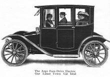 The Argo Electric Vehicle Company was an electric automobile manufacturer that operated in Saginaw, Michigan, United States, from 1912 to 1916. The Argo Electric used a 60 volt system with Westinghouse motors. They claimed to be capable of 20 mph (32 km/h). It had 6 forward and 6 reverse speeds, had 36 x 4 cushion tires and used an 18-inch (457 mm) steering wheel on the left. They were offered in both four- and five-passenger models, with open and closed versions available, and all models used steering wheels. The 110-inch (2,794 mm) wheelbase was the longest of any electric at the time. The Argo Brougham was a 4-passenger car, weighing 3,200 lb (1,451 kg), claimed a range of 75 miles (121 km) per charge using thirty 190 ah, MV Exide batteries.