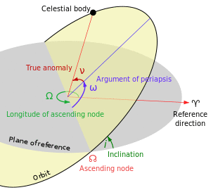 The argument of periapsis (also called argument of perifocus or argument of pericenter), symbolized as ω, is one of the orbital elements of an orbiting body. Parametrically, ω is the angle from the body's ascending node to its periapsis, measured in the direction of motion.