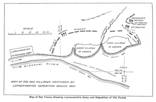 The Sioux, both Yankton and Yanktonai east of the Missouri and Lakota on the west side, had for long been at war with the Arikara, interrupted by short truces on Sioux terms.[9] The Arikaras in question were living in a double village on the west shore of the Missouri, six or seven miles (about 10 km) upstream from the mouth of Grand River. A small creek separated the two fortified villages of earth lodges, each with a heavy frame of wood.[10]