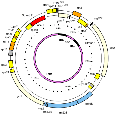 The complete plastid genome sequence of one species of Aristolochiaceae, Hydnora visseri, has been determined. As compared to the chloroplast genome of its closest photosynthetic relatives, the plastome of Hydnora visseri shows extreme reduction in both size (ca. 27 kilo base pairs) and gene content (24 genes appear to be functional).[6] This Aristolochiaceae species therefore possesses one of the smallest plastid genomes among flowering plants.[7]