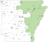 The district took in additional counties in the southeastern portion that were part of the 4th district which in turn took the entire eastern Arkansas border. It fully encompasses the counties of Arkansas, Baxter, Chicot, Clay, Cleburne, Craighead, Crittenden, Cross, Desha, Fulton, Greene, Independence, Izard, Jackson, Lawrence, Lee, Lincoln, Lonoke, Mississippi, Monroe, Phillips, Poinsett, Prairie, Randolph, Saint Francis, Searcy, Sharp, Stone, and Woodruff. The district also encompasses parts of Jefferson county.