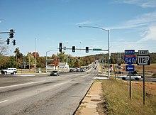Highway 112 (AR 112, Ark. 112, and Hwy. 112) is a north–south state highway in Northwest Arkansas. The route of 25.84 miles (41.59 km) runs from Highway 265 north through Fayetteville, across Interstate 49/US 62/US 71 (I-49/US 62/US 71) to Highway 12 in Bentonville.[2][3] The route serves the University of Arkansas, and thus a portion is named Razorback Road.[4]