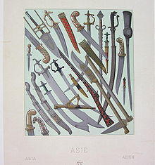 The use of objects as weapons has been observed among chimpanzees,[1] leading to speculation that early hominids used weapons as early as five million years ago.[2] However, this can not be confirmed using physical evidence because wooden clubs, spears, and unshaped stones would have left an ambiguous record. The earliest unambiguous weapons to be found are the Schöningen spears, eight wooden throwing spears dating back more than 300,000 years.[3][4][5][6][7] At the site of Nataruk in Turkana, Kenya, numerous human skeletons dating to 10,000 years ago may present evidence of traumatic injuries to the head, neck, ribs, knees and hands, including obsidian projectiles embedded in the bones that might have been caused from arrows and clubs during conflict between two hunter-gatherer groups.[8] But the evidence interpretation of warfare at Nataruk has been challenged.[9]