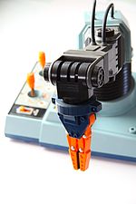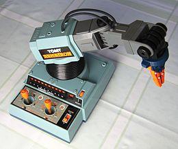 The Armatron is a toy robot which was made by TOMY and distributed by Radio Shack in the United States since 1984.[1] It consists of a crane-like arm which picks up small objects by the user manipulating two attached joysticks. Its shape resembles industrial robots of the 1980s, though it is strictly user-controlled, with no automation built in. The arm has six degrees of freedom: wrist rotation (unlimited), vertical wrist flexing, horizontal elbow bending, shoulder horizontal rotation (unlimited), shoulder elevation, and the opening (releasing) and closing (grasping) of the two-fingered end-effector.