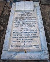 - Thomas Malcolm (1837–1918) / Warden of the Armenian church for 50 years / born 1837 Bushire, Persia / died 6 Mar 1918 Calcutta India. The grave marker is at the Armenian Church Cemetery Lower Circular Road.[13]