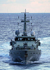 The Armidales can travel at a maximum speed of 25 knots (46 km/h; 29 mph), and are driven by two propeller shafts, each connected to an MTU 4000 16V diesel engine, providing 6,225 horsepower (4,642 kW).[11] The ships have a range of 3,000 nautical miles (5,600 km; 3,500 mi) at 12 knots (22 km/h; 14 mph), allowing them to patrol the waters around the distant territories of Australia, including the Cocos (Keeling) Islands and Christmas Island.[1] The Armidale class has demonstrated an improved seakeeping ability over the preceding Fremantle class: the Armidales are 15 metres (49 ft) longer, 85 tons heavier, and have hydraulic stabiliser fins and trim tabs incorporated into the design, allowing them to survive conditions up to Sea State 9.[1] The vessels are designed for standard patrols of 21 days, with a maximum endurance of 42 days.[1][9]