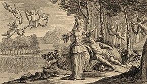 Armide was first performed on 15 February 1686 by the Paris Opera at the Théâtre du Palais-Royal, with scenery by Bérain, in the presence of the Grand Dauphin. The subject for the opera was chosen for Lully by King Louis XIV of France.[1] However, the king would not attend the première or any of the following performances,[2] possibly because Lully was involved in a homosexual scandal.[3] The opera was well received by the Parisians and was revived by the Paris Opera in 1703, 1713–14, 1724, 1746–47, 1761, and 1764.[4] Between 1686 and 1751 Armide was mounted in Marseilles, Brussels, Lyon, Lunéville and perhaps Metz, and was also produced abroad in The Hague, Berlin (with revisions by Carl Heinrich Graun) and apparently, in two concert performances, in Rome.[5]