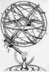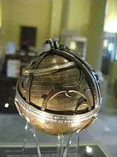 The Greek astronomer Hipparchus (c. 190 – c. 120 BC) credited Eratosthenes (276 – 194 BC) as the inventor of the armillary sphere.[7][8][9][10][11] The name of this device comes ultimately from the Latin armilla (circle, bracelet), since it has a skeleton made of graduated metal circles linking the poles and representing the equator, the ecliptic, meridians and parallels.