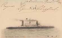 The armored cruiser was developed in the 1870s as an attempt to combine the virtues of the armored ironclad warship and the fast and long-ranged, but unarmored, cruisers of the time. Such a ship was desirable to protect overseas trade and, especially for the French and British, to police their vast overseas empires. The concern within higher naval circles was that without ships that could fulfill these requirements and incorporate new technology, their fleet would become obsolete and ineffective should a war at sea arise.[1] Concern over obsolescence in official circles was further fueled by the race between the increasing size of naval guns and of armor strong enough to withstand such fire. In 1860, one of the largest naval cannons in standard use had a bore of 8 inches (203 mm) and fired a 68-pound (31 kg) solid shot or approximately 51-pound (23 kg) spherical shell. By 1884, guns with as wide a bore as 16.25 inches (413 mm), firing an 1,800-pound (816 kg) exploding shell, were being mounted on naval vessels. This gun could penetrate up to 34 inches of wrought iron, the earliest form of naval armor. These were muzzle-loading guns, as had been used on ships from the 1500s. Breech-loading cannon, which were readopted into naval use in the 1870s, were more destructive than muzzle loaders due to their higher rate of fire. The development of rifled cannon, which improved accuracy, and advancements in shells were other factors. Although a cruiser would not likely face the largest-caliber guns of a battleship and many navies commonly used smaller weapons as they did not wear out as fast as larger ones did, cruisers still needed some form of protection to preclude being shot to pieces.[2]