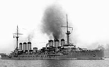 "The supreme embodiment of the armored cruiser," in historian Robert K. Massie's words, was the German ship SMS Blücher.[38] An enlarged version of the Scharnhorst class with a speed of 24.25 knots, armed with 12 8.2-inch (208 mm) and eight 5.9-inch (150 mm) guns, Blücher was planned as an armored cruiser in part because the British had misled the Germans on the Invincibles then being constructed. The Germans expected these new British ships to be armed with six or eight 9.2 in (23 cm) guns.[39] One week after the final decision to construct Blücher, the German naval attache learned they would carry eight 30.5 cm (12.0 in) guns, the same type mounted on battleships. With no funds available to redesign Blücher, work was ordered to proceed as scheduled.[40] Although much more powerful than a typical armored cruiser, she was significantly weaker than the new British battlecruisers.[41]