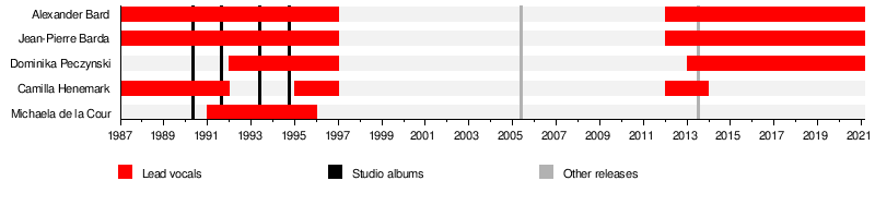 While Alexander Bard was the brain behind the band, Jean-Pierre Barda was the lead vocalist on hits such as "Crucified" and "Israelism". Bard and Barda were the only two band members who were present throughout all of the band's various line-ups. When La Camilla left in 1991, she was replaced by Michaela de la Cour. In 1992, Dominika Peczynski joined, making the band a four-piece. In 1995, De la Cour left and Henemark returned.