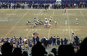 In 1963, shortly after the assassination of President John F. Kennedy, Jacqueline Kennedy urged the academies to play after there had been talk of cancellation. Originally scheduled for November 30, 1963, the game was played on December 7, 1963, also coinciding with the 22nd anniversary of Pearl Harbor Day.[13] In front of a crowd of 102,000 people in Philadelphia's Municipal Stadium, later renamed John F. Kennedy Stadium, junior (second class Midshipman) quarterback Roger Staubach led number two ranked Navy to victory which clinched a Cotton Bowl national championship matchup with Texas. Army was led by junior (second class Cadet) quarterback Rollie Stichweh. Stichweh led off the game with a touchdown drive that featured the first use of instant replay on television. Army nearly won the game after another touchdown and two point conversion, Stichweh recovered the onside kick and drove the ball to the Navy 2 yard line. On 4th down and no timeouts, crowd noise prevented Stichweh from calling a play and time expired with the 21–15 final score. Staubach won the Heisman Trophy that year and was bumped off the scheduled cover of Life magazine due to the coverage of the assassination. Stichweh and Staubach would meet again in 1964 as seniors where Stichweh's Army would defeat Staubach's Navy. In that game, Calvin Huey of Navy became the first African-American to play in the series.[14] Staubach went on to serve in the Navy and afterward became a Pro Football Hall of Fame quarterback with the Dallas Cowboys. Stichweh served five years in Vietnam with the 173rd Airborne Brigade. Stichweh was inducted into the Army Sports Hall of Fame in 2012.[15][16]