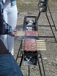 Arrosticini are a class of traditional Abruzzese cuisine from the Italian region of Abruzzo.[1] Arrosticini (rustelle or arrustelle in the local dialects; also known as spiedini or spiducci) are typically made from castrated sheep meat, or lamb, cut in chunks and pierced by a skewer. It is cooked on a brazier with a typically elongated shape, called furnacella as it resembles a gutter.