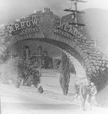 In 1924, architect Arthur B. Benton, designed a rustic concrete entrance archway encased in ornamental boulders. The archway stood 15 feet high with a 26-foot span. It appears the arch location was at 34°10′58″N 117°16′26″W / 34.18278°N 117.27389°W.