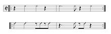 When clave is written in two measures, as shown above, the measure with three strokes is referred to as the three-side, and the measure with two strokes—the two-side. When the chord progression begins on the three-side, the song, or phrase is said to be in 3-2 clave. When it begins on the two-side, it's in 2-3 clave.[17] The 2-3 bass line of "Dame un cachito pa' huele" (1946) coincides with the three-side of the clave's five-note pattern.[18][19] David García identifies the accents of "and-of-two" (in cut-time) on the three-side, and the "and-of-four" (in cut-time) on the two-side of the clave, as crucial contributions of Rodríguez's music.[20] The two offbeats are present in the following 2-3 bass line from Rodríguez's "Mi chinita me botó" (1944).[21]