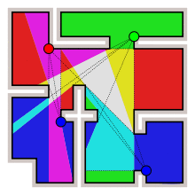 There are a number of other generalizations and specializations of the original art-gallery theorem.[6] For instance, for orthogonal polygons, those whose edges/walls meet at right angles, only guards are needed. There are at least three distinct proofs of this result, none of them simple: by Kahn, Klawe, and Kleitman; by Lubiw; and by Sack and Toussaint.[7][8]