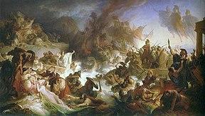 - ^ a b On the identification with Artemisia: "...Above the ships of the victorious Greeks, against which Artemisia, the Xerxes' ally, sends fleeing arrows...". Original German description of the painting: "Die neue Erfindung, welche Kaulbach für den neuen hohen Beschützer zu zeichnen gedachte, war wahrscheinlich „die Schlacht von Salamis“. Ueber den Schiffen der siegreichen Griechen, gegen welche Artemisia, des Xerxes Bundesgenossin, fliehend Pfeile sendet, sieht man in Wolken die beiden Ajaxe" in Altpreussische Monatsschrift Nene Folge p. 300