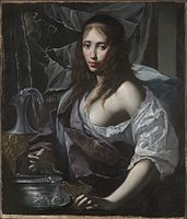 Artemisia is always shown with a cup or urn, either alone or with a group of attendants offering or helping to mix the drink. The subject is therefore very similar to Sophonisba taking poison, and the Rembrandt, and a Donato Creti in the National Gallery, are examples of works where the intended subject remains uncertain between the two.[8]